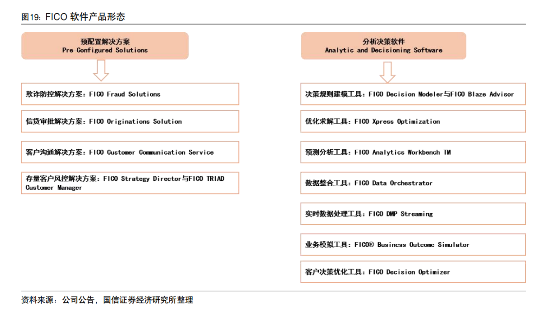 FICO软件业务本质是为企业提供决策基础设施,聚焦金融、零售、制造等行业的风险控制、客户管理运营优化等核心场景。产品形态上包括两类,一是预配置型管理解决方案(pre-configured analytic and decision management solutions),二是模块化软件产品(modular software),两类产品形成互补生态,帮助企业在不同发展阶段平衡标准化与个性化需求。