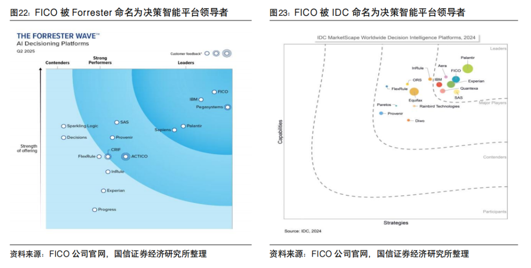 在《IDC Market Scape: Worldwide Decision Intelligence Platforms 2024 Vendor Assessment》报告中,FICO Platform被命名为领导者。同时,在《The Forrester Wave™: AI Decisioning Platforms,Q2 2025》中也被命名为领导者,在所有评估平台提供者中,该平台在13项评分标准中获得了最高评价。根据Forrester报告,FICO Platform通过端到端的集成解决方案,支持在整个客户旅程中做出更智能的决策,打破信息孤岛,并使团队能够更轻松地协作和创新。
