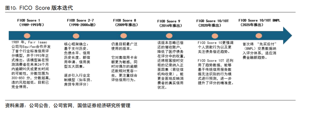 FICO Score是公司主力产品,于1989年首次引入,并不断迭代升级创新,持续在行业中保持领先水平。当前运用最广泛的基础版本是FICO Score 8,2020年推出最新版本FICO Score 10/10T,10T更强调对近期信用行为的关注(尤其是疫情后经济恢复期间的还款记录),同时对“高负债使用率”的惩罚更严格,还会识别“循环债务频繁波动”的风险行为。2025年推出FICO Score 10/10T BNPL,首次将“先买后付”(BNPL)数据纳入评分系统,反映了分期贷款在信贷生态系统中的重要性。