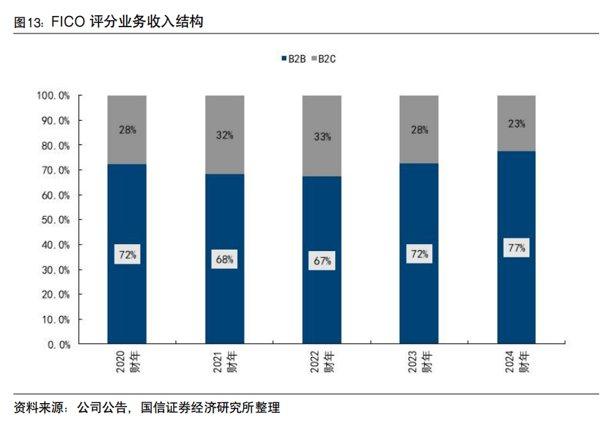 2024财年公司B2B评分业务收入为7.12亿美元,占收入总额的77%,同比增长26.9%;B2C评分业务收入2.08亿美元,占收入总额的23%,同比下降2.4%,2021财年以来myFICO.com网站的直销收入基本上没有增长。我们认为或与公司战略重心自2022年以来在于推进软件服务平台化(后续详细分析)有关。长期来看,公司B2C订阅服务成长空间巨大。