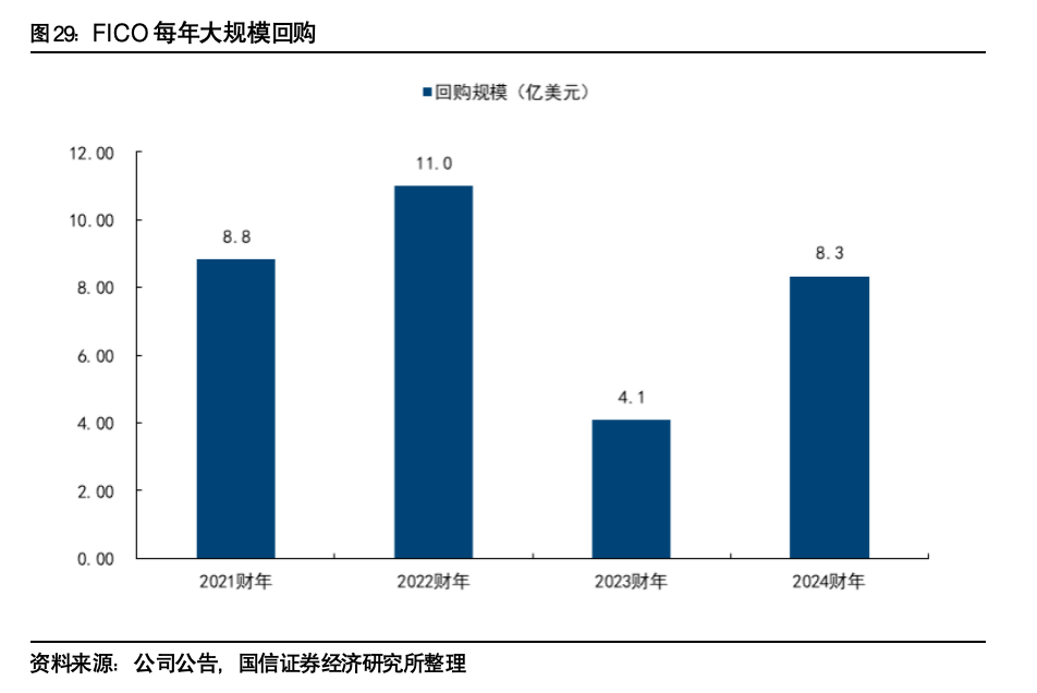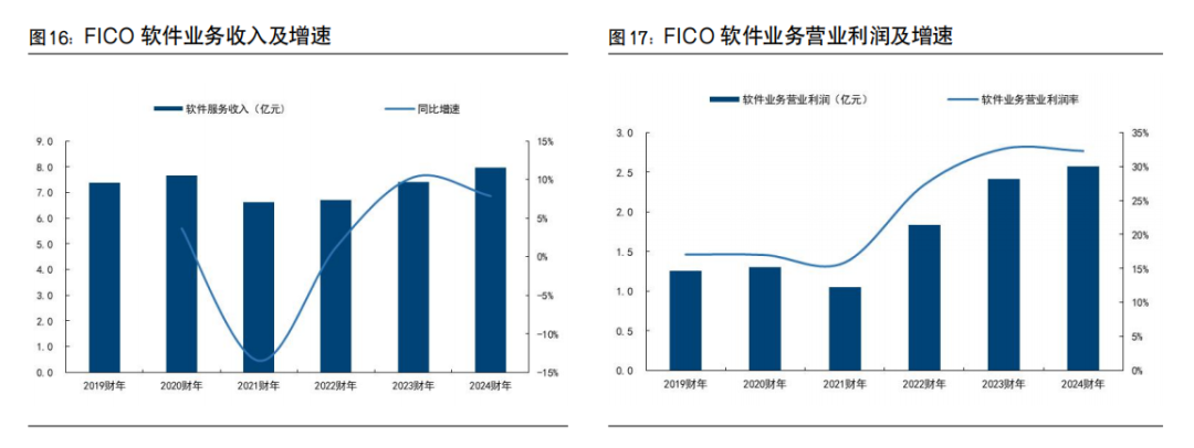 FICO的软件业务主要围绕决策管理和预测性分析构建,以帮助客户更高效地锁定并获取目标客户、提升客户价值、减少欺诈与信贷损失、降低运营成本等。目前FICO为全球80 多个国家的企业客户提供软件服务,2024财年软件业务实现营收7.98亿美元,同比增长7.9%,实现营业利润2.58亿美元,同比增长6.8%。2024财年软件业务营业利润率32.3%,自2022财年开始明显提升,主要得益于其平台化战略成效明显。