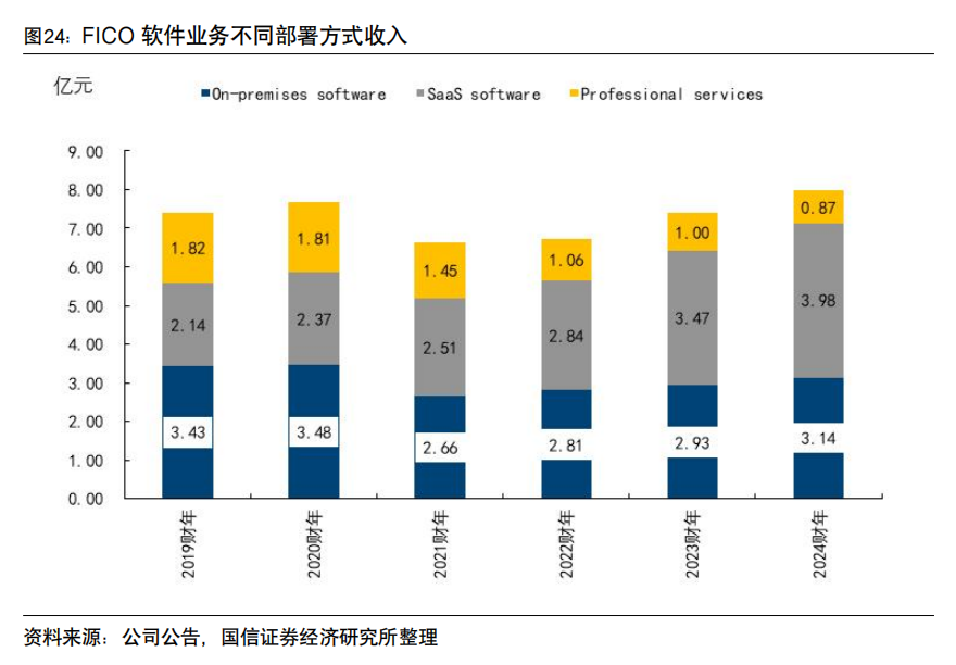 除了提供软件产品外,FICO还会提供一系列专业服务,旨在帮助客户安装和配置公司软件、使用公司软件开发和部署高级分析等。2024年,公司软件部门收入合计7.98亿美元,其中本地部署业务收入3.14亿美元,SaaS业务收入3.98亿美元,专业服务收入0.87亿美元。由于2022年以来公司积极推动平台化战略,SaaS收入快速增长。