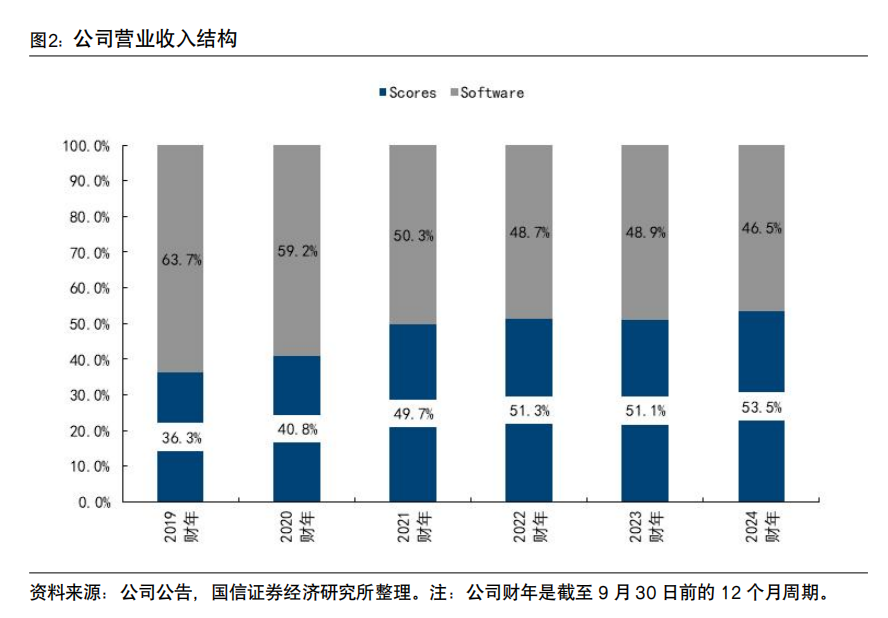 1.2 业务版图:FICO评分和软件服务双轮驱动目前公司业务有两个运营部门:信用评分(Score)以及软件解决方案(Software),构建了“数据标准+技术工具”的双轮驱动模式。信用评分业务建立用户粘性,软件解决方案通过技术工具深化场景渗透,共同巩固FICO作为全球决策管理大师的地位。从收入占比上看,2024财年Score业务贡献为53.5%,Software业务贡献为46.5%。
