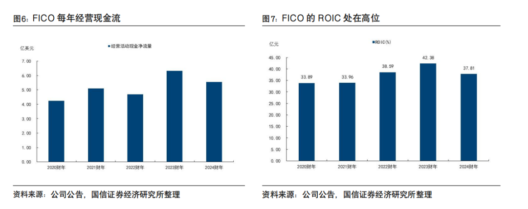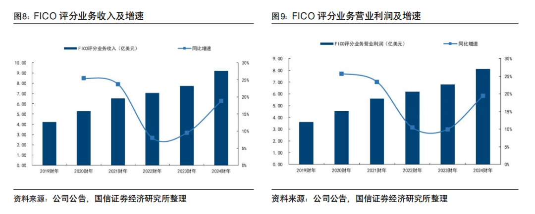 美国放贷机构对FICO评分依赖性强,替换成本高,评分业务本身具有极高的天然护城河。FICO Score由公司于1989年首次引入,旨在帮助贷款机构评估借款人的信用风险,通过持续的技术创新和客户资源积累,FICO已建立了信用评分领域的全球领导地位。公司2024财年评分业务收入达到9.2亿美元,同比增长18.8%,过去五年年均复合增速为16.9%;2024财年评分业务营业利润达8.13亿美元,同比增长19.4%,过去五年年均复合增速为17.6%。