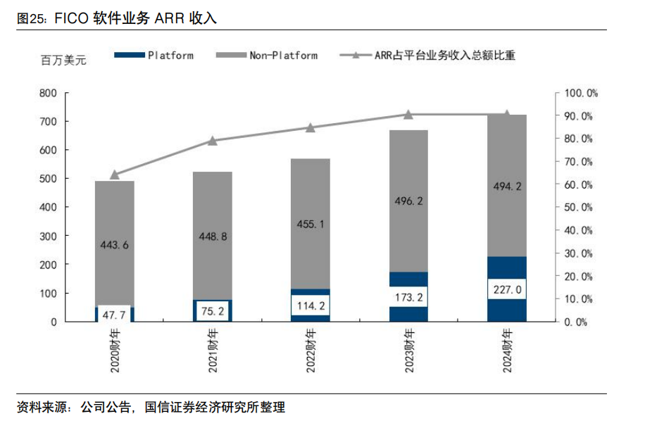 软件业务围绕决策管理与预测性分析构建,2022年以来平台化战略进一步强化其核心壁垒。2024财年软件业务实现营收7.98亿美元,营业利润2.58亿元,营业利润率32.3%。FICO的软件业务主要围绕决策管理和预测性分析构建,产品形态包括预配置行业解决方案和模块化软件两类。2022年以来公司积极推动平台化战略,FICO Platform本质是为解决企业决策碎片化痛点打造的一套集分析与决策一体化的中心决策底座,基于“数据→预测→决策→落地”的逻辑,将预配置行业套件与分析决策工具拆解为四大模块化功能,且支持灵活配置与扩展。平台化战略推动收费模式向“平台订阅+用量计费”转型,SaaS收入以及平台ARR都实现了很好的增长。
