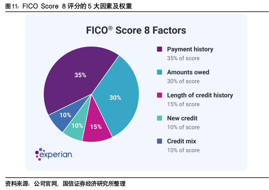 除了FICO Score外,公司还会提供一些基于特定的FICO行业得分。例如,2021年公司推出了FICO Score10的汽车行业版本;针对信用卡申请的FICO Score 8 Bankcard版等,评分逻辑会根据具体场景调整。