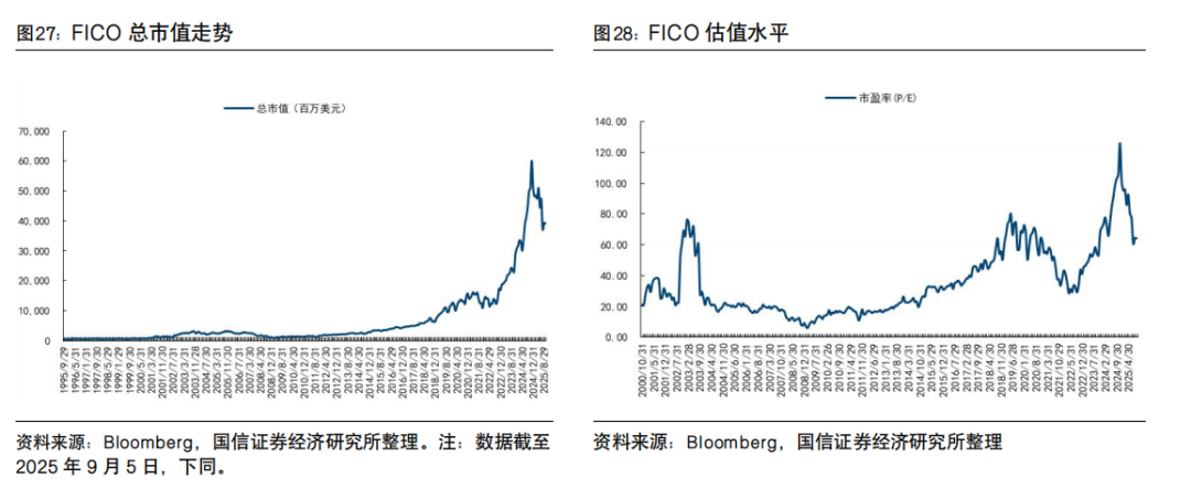 2022年公司平台化战略推进后,公司市值高歌猛进,从2022年初的134亿美元达到2024年末的约600亿美元。但由于上文提到的美国监管机构改革信用评分体系,FHFA将Vantage Score 4.0历史数据发布时间从2025Q1提前至2024Q3,并在2025年7月FHFA宣布立即生效允许贷款机构在两房贷款中自主选择使用Vantage Score或FICO Score,市场担忧监管压力可能影响FICO的市场份额,因此2025年公司估值出现明显回落。截至2025年9月5日,FICO总市值为391亿美元,PE约为63x。