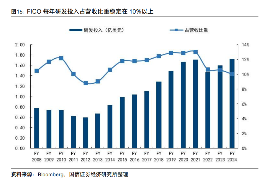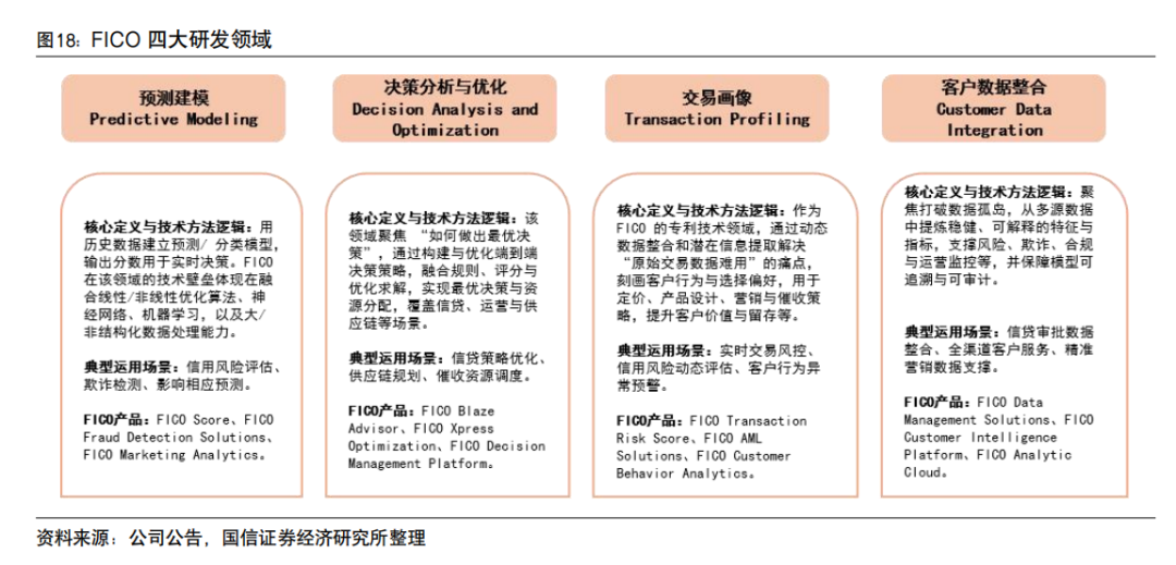FICO核心研发聚焦于四大分析领域,预测建模、决策分析与优化、交易画像和客户数据整合。FICO 的四大研发领域形成了“数据→预测→决策→落地”的闭环,客户数据整合提供统一数据基础,交易画像将原始交易数据转化为“可用特征”,预测建模基于数据预测未来风险/响应概率,决策分析与优化输出最优行动方案。这种闭环能力使 FICO 从“单一评分供应商”升级为“端到端决策解决方案提供商”,也是其在信用风险、欺诈检测等领域长期占据市场主导地位(如90%美国金融机构使用FICO 评分)的核心原因。