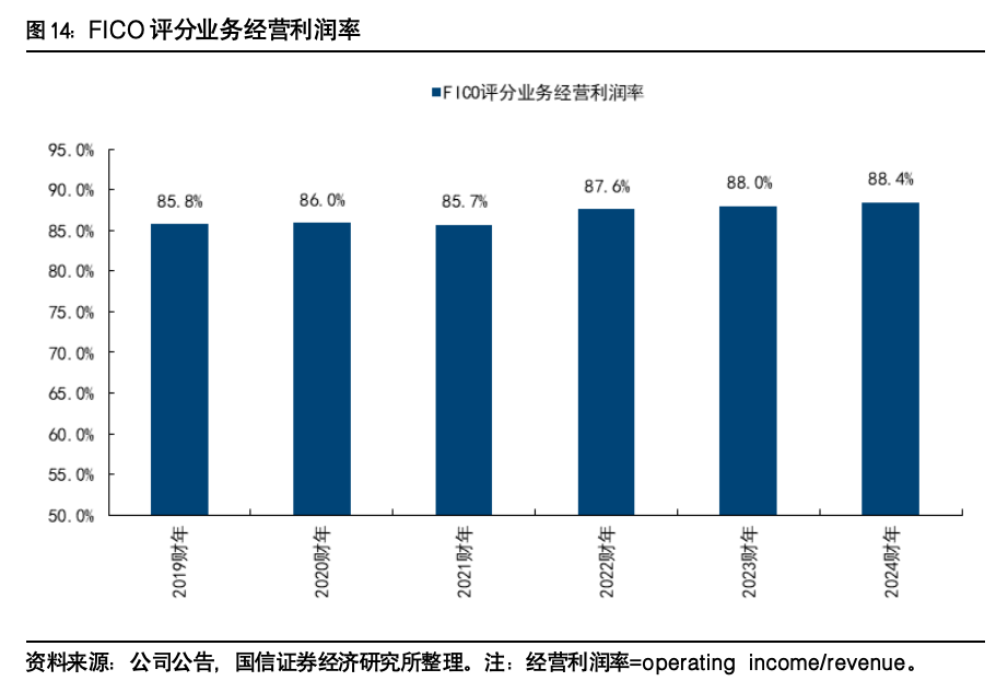 FICO评分业务经营利润率高达85%以上。FICO评分在行业内处于绝对主导地位,美国约90%的贷方采用其评分模型,使得FICO在与客户的合作中拥有极强的议价能力。比如,FICO在按揭市场按“每条评分”收取固定许可费,2025年起为每条4.95美元,2024年为每条3.50美元,涨幅达到41%。同时,FICO长期的数据积累使得其无需在获取基础数据上投入过多新增成本,同时其成熟的模型算法经过多年打磨优化,研发成本相对稳定。