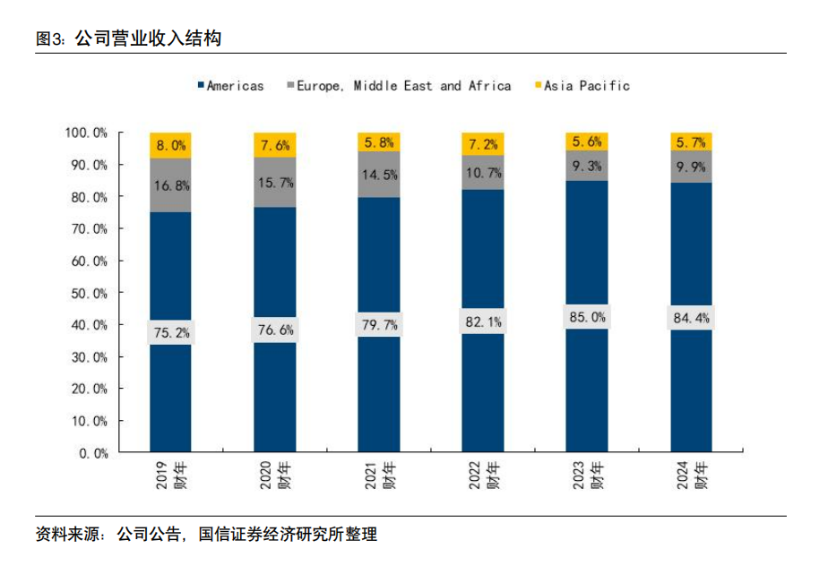经营区域上,美洲市场收入贡献超过80%。2024财年公司美洲市场收入贡献为84.4%,较2019年提升了9.2个百分点。2024财年欧洲/中东/非洲市场收入贡献为9.9%,亚洲地区收入贡献为5.7%,较2019财年分别下降了7.0个和2.3个百分点。